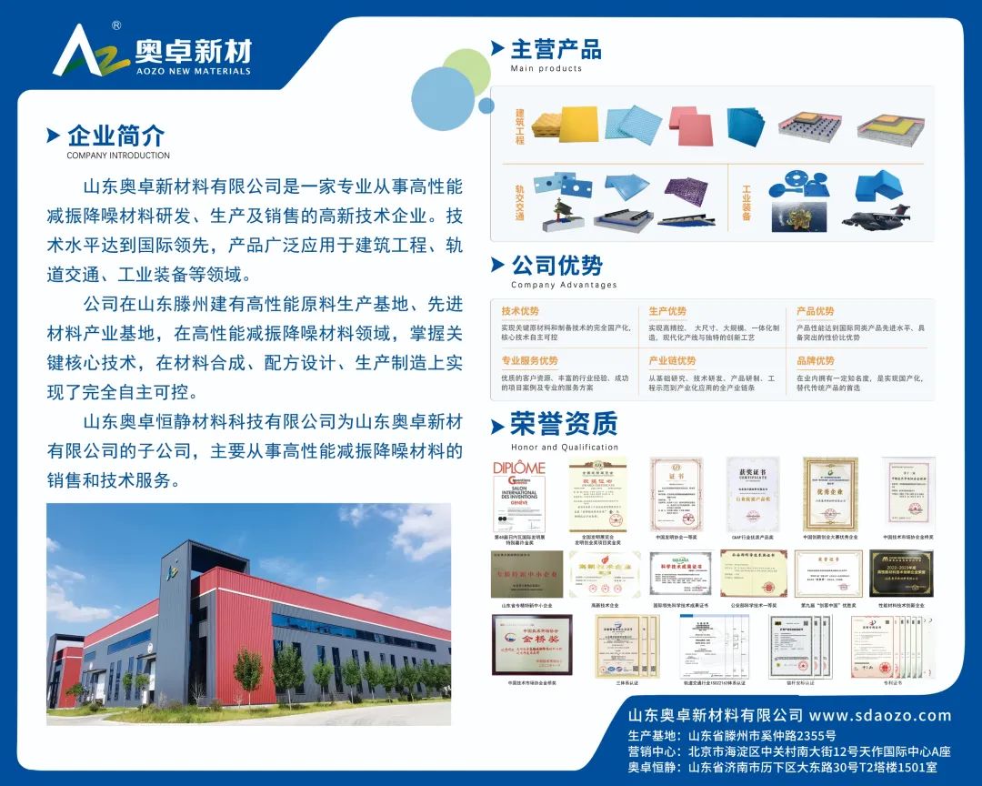 山東奧卓新材料有限公司是一家專業(yè)從事高性能減振降噪材料研發(fā)、生產及銷售的高新技術企業(yè)。技術水平達到國際領先,產品廣泛應用于建筑工程、軌道交通、工業(yè)裝備等領域。